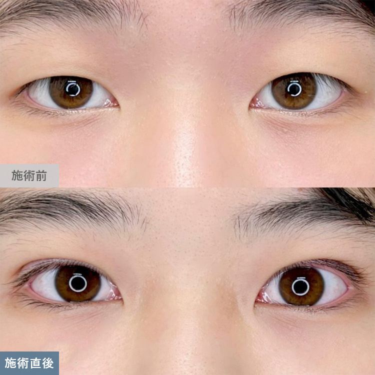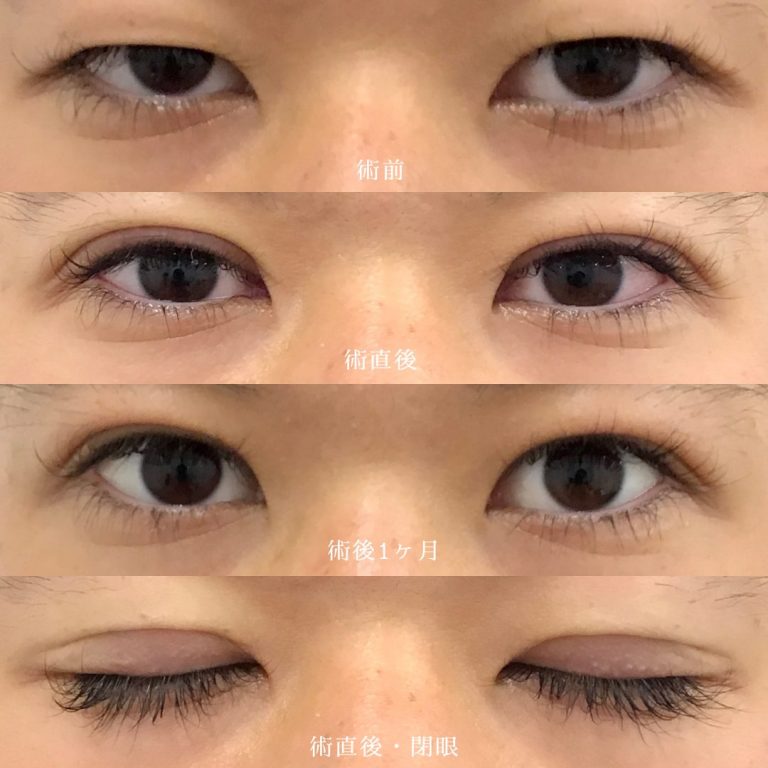 まぶたの裏側から上眼瞼挙筋を折り込んで、2点留めて縛ることで筋肉を短くし、目を開きやすくする施術です。 外から傷跡は目立ちにくく、切開法と比べて腫れも少ないのが特徴です。 |