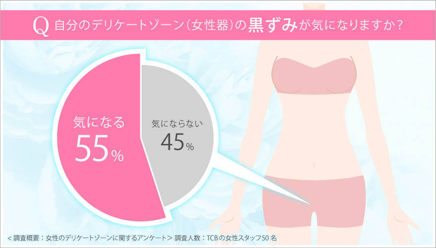 TCBのスタッフにアンケートを実施したところ、デリケートゾーン(女性器)の黒ずみが「気になる」と回答した女性が55%もいることが判明しました。
