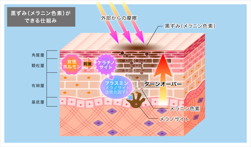 メラニン色素は、摩擦・女性ホルモン・ストレス・紫外線から刺激を受けることで、皮膚を守るために過剰に生成されます。メラニン色素が生成されることで、色素沈着と変わり、皮膚が黒ずんでみえるのです。